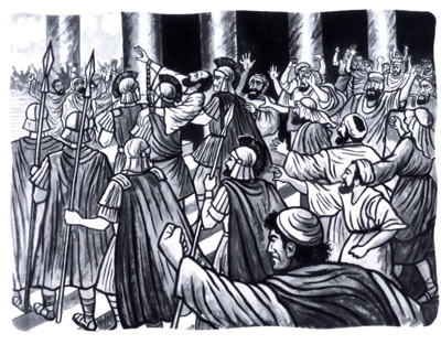 “The shouts went up that Paul had ‘brought Greeks’ into the temple and had ‘polluted this holy place’ (Acts 21:28). In the menacing mob, whatever Paul said was unheard as he was pushed through the outer gate and given the first blows of an intended deadly beating. But the Roman garrison was trained to stop such riots before they spread, and they moved fast enough to save the apostle’s life. Fortunately for Paul, he had been assaulted in the temple, for the Roman fortress Antonia loomed above the temple on the north with watchtowers high enough to see the first disturbance.” (Richard Lloyd Anderson, Understanding Paul, 230 – 231.)