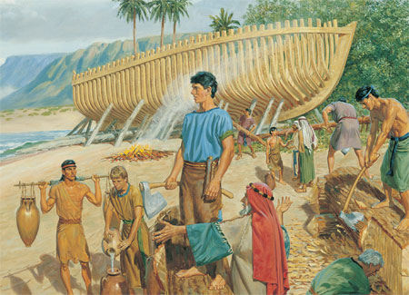 ‘Nephi did not get to enjoy the luxury of life on the beach very long. He was told to go into the high mountain nearby. Imagine his surprise to be shown a vision of a ship which he was told to construct. It was not like any ship he had ever seen but the Lord said it was necessary to carry their entire congregation across the great waters to the promised land.