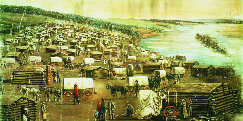 Throughout 1845 anti-Mormon persecution in Illinois grew in frequency and intensity. By Autumn it was clear that the city of Nauvoo would have to be abandoned. The exodus began prematurely in February as a result of mob violence. In appalling conditions and intense suffering the saints made their way across Iowa to Winter Quarters. The westward migration continued throughout 1846 until by Christmas some 10,000 people were accommodated in temporary homes, some in just tents or wagons, the more fortunate in turf or timber shacks and cabins.