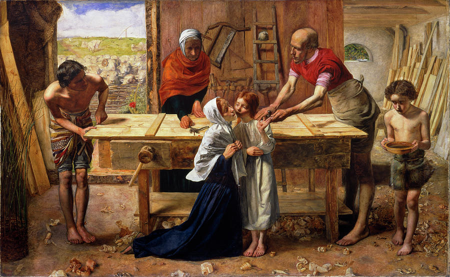 Joseph has paused in his work, tool still in hand, to reach out and comfort the boy. His physique is lean and wiry and was modelled by Millais on a real carpenter. Joseph is very much a mortal father.